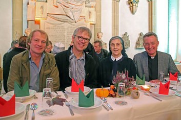 Zum Gastmahl im Dom waren etwa 70 geladene Menschen gekommen, darunter auch Hans Dieter Schettke (links). Joachim Veenhof, Geschäftsführer des SKM, Wohnungslosenseelsorgerin Schwester Ulrike Tyws und Dompropst Monsignore Joachim Göbel (v.l.) halfen den Tag zu etwas Besonderem zu machen.